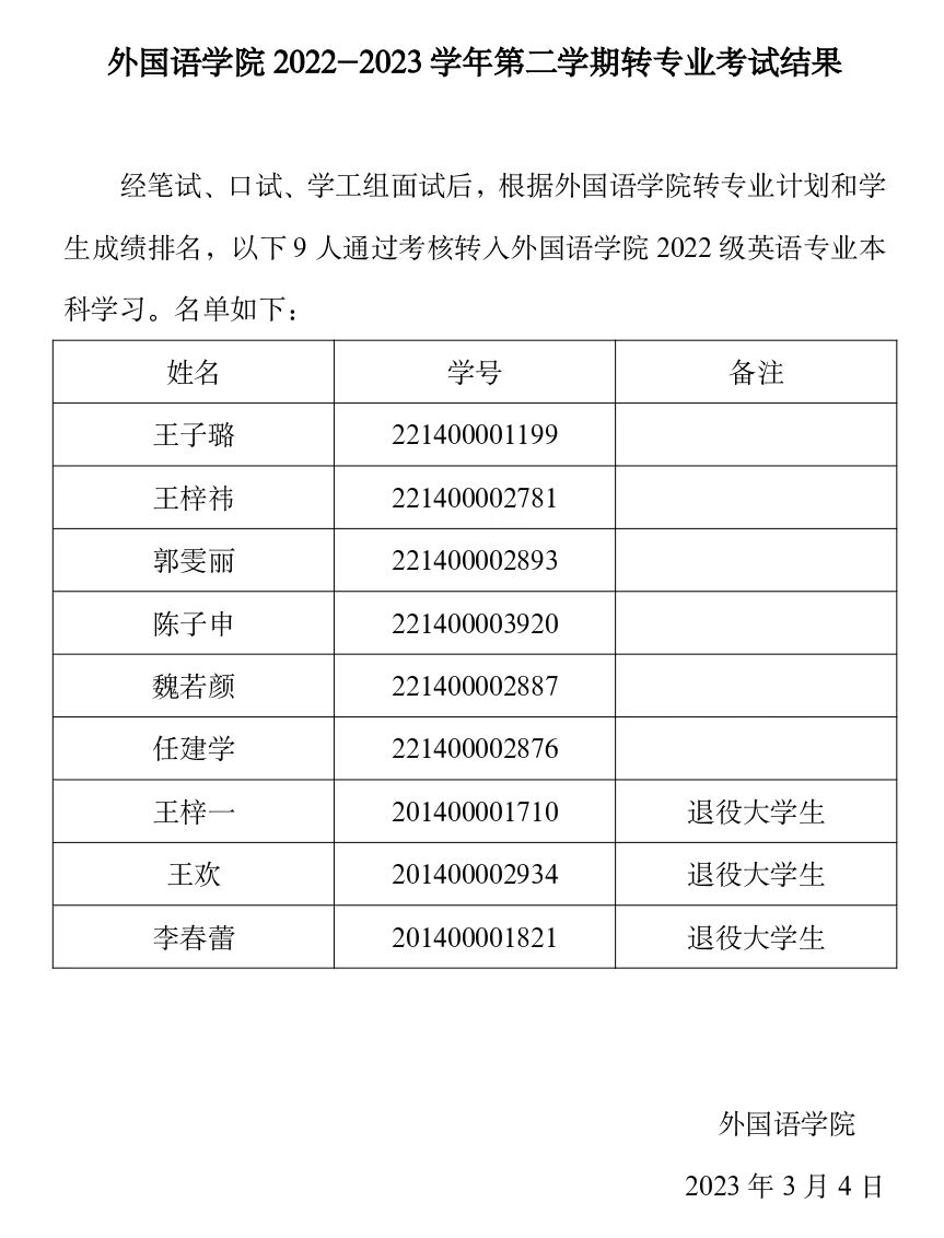 yl7703永利官网2022-2023学年第二学期转专业考试结果